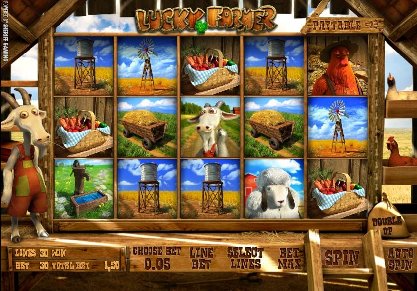 Lucky farmer оснащен пятью барабанами, на которых изображены различные предметы фермерской атрибутики. Символы размещены в три ряда. Слот предлагает 30 линий, которые могут приносить удачу. Ставка на линию не должна превышать пяти монет. Что касается номиналов, то принимаются монеты от пяти центов до пяти евро. Автомат предлагает множество вариантов для выигрыша. В вашем распоряжении бонусные раунды, особые символы, игра на удвоение, всё это позволяет многократно увеличить первую ставку.