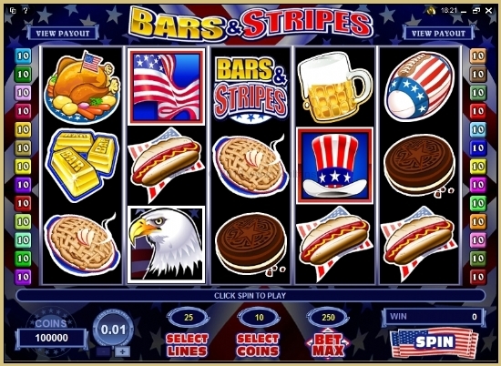 Разработчики из компании Microgaming, создали классический интересный пятибарабанный слот. Как вы уже догадались, разнообразные игровые символы будут нести в себе тематику звездно-полосатого флага. В наличии такие игровые символы: шляпа-цилиндр, мяч для игры в регби, хот-дог – все эти символы выполнены в звездно-полосатой цветовой гамма флага США. Помимо этих символов, в игре есть такой знак как BAR, он изображен в виде слитков золота, или же логотипа игры.