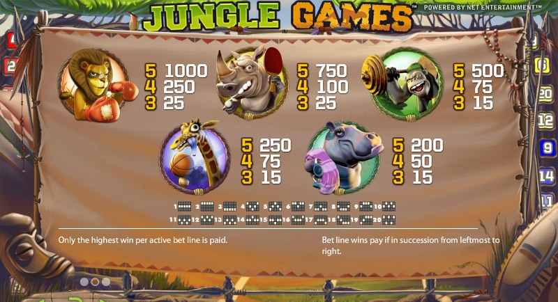 Соревноваться участникам «Игры джунглей» предстоит на двадцати игровых линиях. На каждую из них за одно вращение игрок может поставить от одной до четырех монет, номинал которых варьируется от двух до пятидесяти центов. Одним из самых ценных символов игры является изображение Кубка, которое в количестве пяти штук на одной из активных линий приносит участнику десять тысяч кредитов. Этот трофей выступает еще и диким символом, дополняющим комбинации. Заменять собой он может все кроме скаттеров.