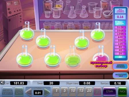 Так же в этом игрище существует игра на риск, которая представляет собой своего рода урок химии! Именно химии! Вам необходимо будет верно назвать, в какую именно колбу следует капнуть реактив, дабы получилась розовая жидкость. Именно в такой ситуации сумма выигрыша удвоится, затем преумножится в четыре, раза, затем в восемь, затем в шестнадцать и так дальше раз. Однако необходимо помнить, если в процессе ваших экспериментальных действий произойдет взрыв, тогда вместе с ним и взорвутся все ваши денежки. Удачи!