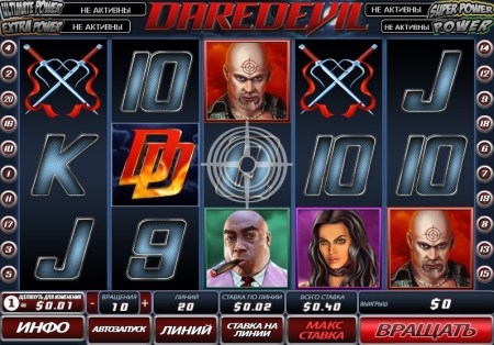 Не так давно был создан игровой автомат Daredevil. Эта новая игра создана по сюжету известного фильма с одноименным названием. Игровая площадка состоит из пяти барабанов , это позволяет игрокам развлекаться сразу на двадцати секторах игры. Главными действующими символами представляются персонажи из фильма о Сорвиголове.