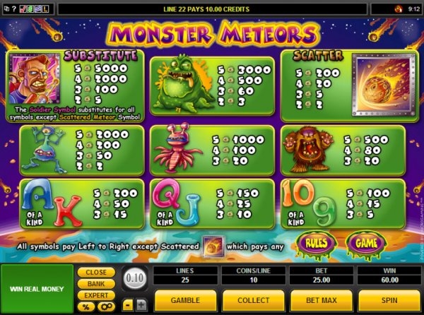 Производители игровых автоматов решили сделать «Monster Meteors» из 25 активными линиями. Здесь много ужасных монстров: красных и зеленых, глазастых и с длинными щупальцами. Все они имеют определенное вознаграждение, которое прилагается в списке выплат. Самый страшный монстр в виде небритого вояка является главным «диким» символом. Он заменяет все другие символы, кроме бонуса.