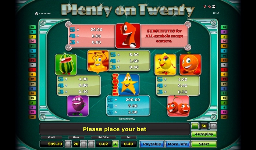 Появилось много новых игровых автоматов, которые имеют разные сюжеты и правила, символы и бонусы. Однако традиционные звездочки, семерки, вишенки и другие фрукты популярные и до сих пор. Поэтому «Plenty on Twenty» - это новый игровой автомат с классическим оформлением, но в другой интересной обработке, поверьте, удивит и порадует многих. Ожившие фрукты приобретают свой характер. Апельсин улыбается и предлагает начать игру, проказливые вишенки весело подмигивают и предлагают испытать удачу, лимон постоянно хочет, колокольчик беззаботно покачивается на штанге, а беззубый арбуз веселит игроков.