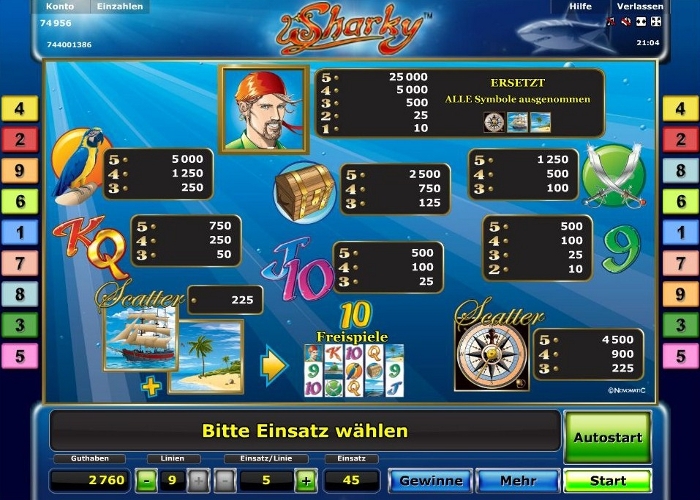 Кто скрывается от своей жены, а кто-то от бдительного рыбнадзора и поэтому предпочитает играть бесплатно и без регистрации. Кто-то же просто проводит предварительную разведку акватории и это правильно. Любителей половить рыбку в этом игровом автомате ожидают пятнадцать линий, на каждую из которых одновременно можно поставить не более десяти монет. Номинал их при этом варьируется от одного до пятидесяти центов, зависит от того, на каких размеров добычу вы нацелены. Пять Красных рыб большого размера приносят самый ценный и желанный улов игр в виде двух тысяч кредитов. Комбинации, кстати, засчитываются с любой стороны, как с левой, так и с правой. Роль дикого символа в «Sharky» отведена Золотой блесне. Вайлд меняет символы, которых не хватает для составления оплачиваемой комбинации. Не по силам ему бороться разве что с скаттером.
