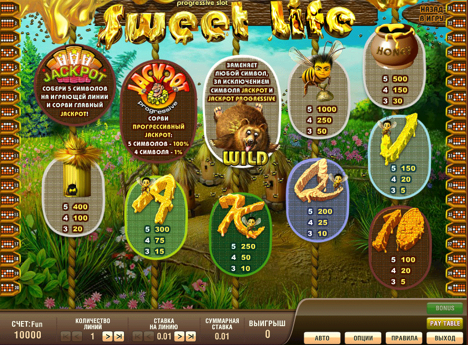 Чтобы отправиться в удивительный мультипликационный мир «Сладкой жизни», достаточно лишь одного нажатия кнопки запуска. Сюжет этого эмулятора очень веселый, поэтому, возможно, вам даже понравиться играть на нем в бесплатном демо-режиме. Чтобы «Sweet Life» по достоинству вас вознаградил, нужно быть смелым и напористым и, конечно же, делать ставки реальными деньгами. Опасайтесь неуступчивых пчел, которые всячески будет вам препятствовать в добыче меда.