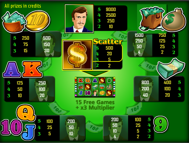 Перед вами игровой автомат, который имеет пять активных барабана с девятью линиями для выплат. Итак, символы в виде зеленых купюр, монет, мешков с деньгами и кошельков умножают вашу начальную ставку в несколько десятков раз, и даже в тысячи раз! Символ американского доллара дает бесплатные спины, а портрет банкира помогает достичь мега удачливых комбинаций.