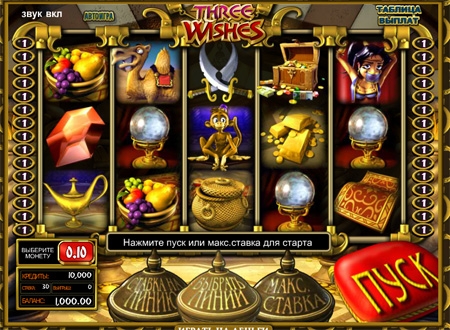 Дополнительные возможности видео слота Three Wishes станут приятным сюрпризом для пользователей. Игра предусматривает наличие дикого символа (каковым является волшебная лампа), бонусная комбинация принесет определенное число дополнительных бесплатных вращений (на игровом поле должно высветиться три символа разброса – сундука с сокровищами).