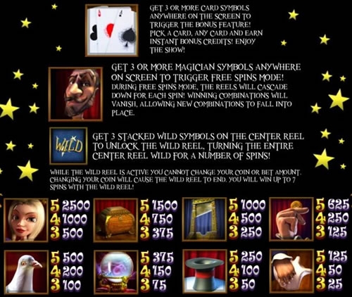 Моментальный выигрыш можно получить в специальной бонусной игре, связанной с картами. Когда на барабанах выпадут три, четыре или пять карт, выбирайте любую из них и забирайте приз. Но, чтобы сделать правильный выбор, необходимо обладать развитой интуицией и уметь разгадывать изощренные трюки хитрюги-фокусника.