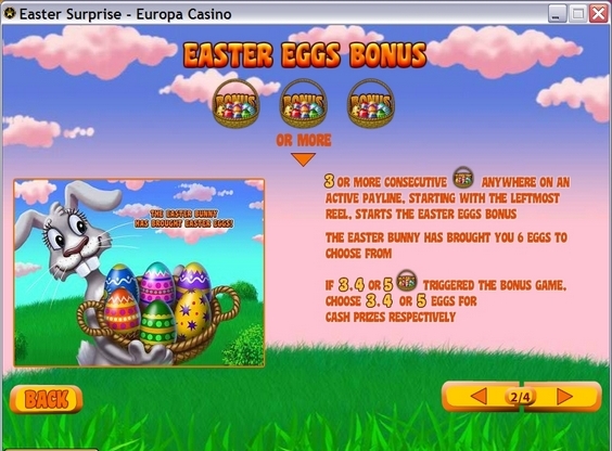 Бонусная игра будет немедленно активирована, если на барабанах появится три символа с изображением корзинки с пасхальными яйцами. В призовой игре главный персонаж слота предложит вам выбрать пару яиц, в которых будут находится бонусные выплаты. Помимо выплат, в этом режиме также можно выиграть и другие призы в виде денежных бонусов в приличных размерах.