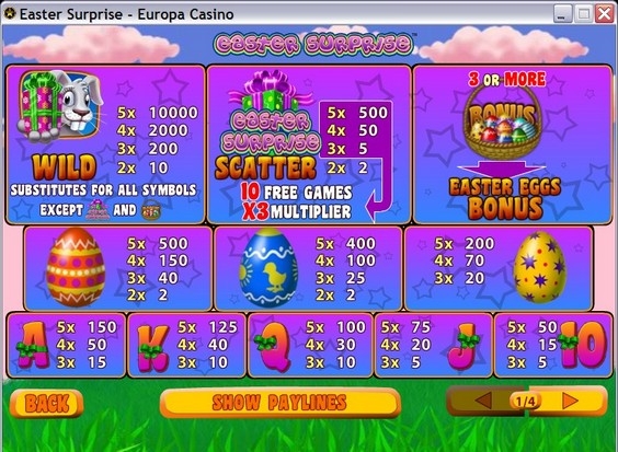 Уважаемые игроки, вашему вниманию предлагается великолепный игровой автомат «Easter Surprise». Если кто-то из вас безумно любит такой праздник как Пасха и невероятно соскучился по веселью, подаркам, отличному настроению и пасхальным кроликам – этот слот однозначно для вас. Но предупредим вас сразу: для игры на этом автомате вам потребуется приличный запас морковки, чтобы заманивать кроликов на свою сторону, тем самым обогащая себя финансово. Слот «Easter Surprise» просто переполнен разными игровыми возможностями, приятными сюрпризами и, естественно, крупными выигрышами.