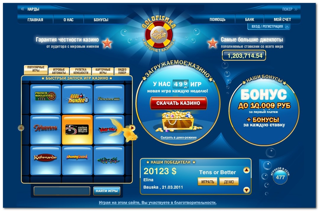 Как известно, при регистрации и открытии счета в этом виртуальном игровом заведении вы получаете десять тысяч рублей в качестве вступительного бонуса. С целью тестирования автоматов компании Microgaming на счет казино было внесено 60 у.е. без особой надежды получить хоть какой-то выигрыш. Как и следовало ожидать, первая половина внесенной суммы была благополучно «съедена». Но спустя некоторое время, игра на слотах Голдфишки принесла выигрыш в сумме 300 у.е. Так что выиграть на автоматах вполне реально. Всё зависит от умения выбрать честное заведение, везения, и умения вовремя остановиться. Помните, на игровых автоматах не получится получать регулярные выплаты.