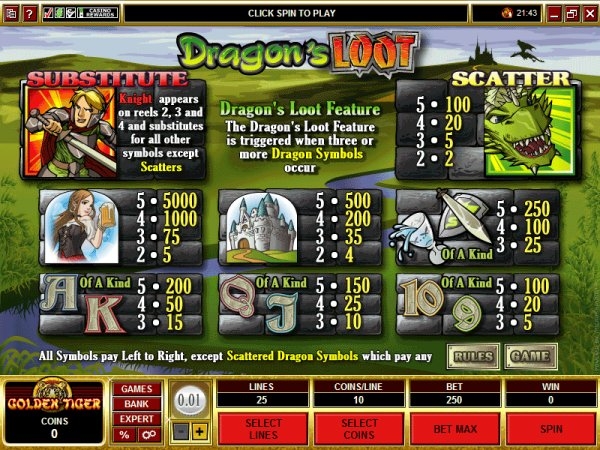 Игровой автомат Dragon’s Loot представляет игрокам привычные пять барабанов, линий для игры может быть двадцать пять. Накопительные джекпоты в этой модели не разыгрываются. Дизайн слота выдержан в стиле средних веков, но с небольшим уклоном в сторону Востока. Базовые картинки представляют изображения средневековых рыцарей, замков, мечей, конечно же, драконов и многого другого. Сопровождает игру приятная и негромкая музыка, которая не отвлекает от игры, но и не дает разгулятся эмоциям.