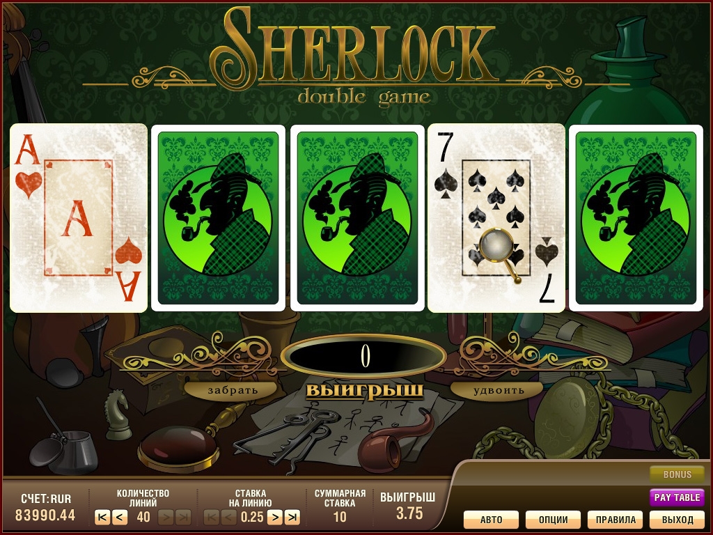 При выпадении комбинации соответствующей 5-ти символам Джекпота при игре в демонстрационном режиме на FUN счет игрока начисляется вся сумма Джекпота. Что же касается дикого символа (в этой игре он представлен злым гением, профессором Мориарти), то при замене им любого другого персонажа можно сделать выигрыш максимальным. Практически любой выигрышный ход можно удвоить, исключение составляют только различные комбинации Джекпота. Суть удвоения выигрыша довольно проста и является стандартной в играх данного типа. Вам необходимо выбрать одну из 4-х предоставленных карт, причем эта карта должна оказаться больше карты казино. После игры на удвоение, вы возвращаетесь в центральное окно игры автомата.