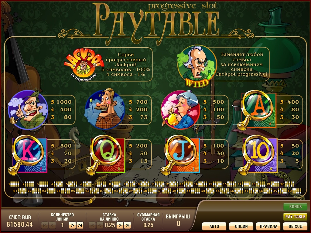 Пятибарабанные игровые автоматы "Sherlok" имеют 40 линий выплат. Однако при этом принимаются только бронзовые ставки – от 0,01 FUN монеты до 25 фишек на одну линию. Максимум можно поставить 1000 FUN монет.