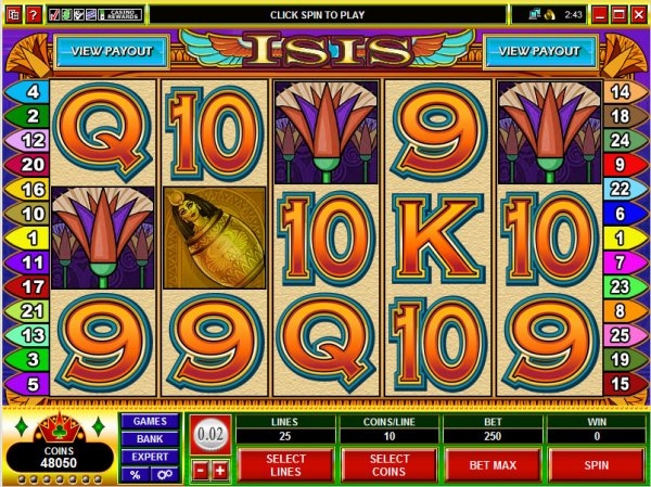 Слот Изис состоит из пяти барабанов, поделенных на двадцать пять линий, на которые игрок может сделать ставку, максимальный размер которой составляет десять игровых монет. Игрок Изиды может получить тридцать дополнительных вращений барабанов совершенно бесплатно, в случаи получения на выбранных им линиях трех и более изображений Сокола.