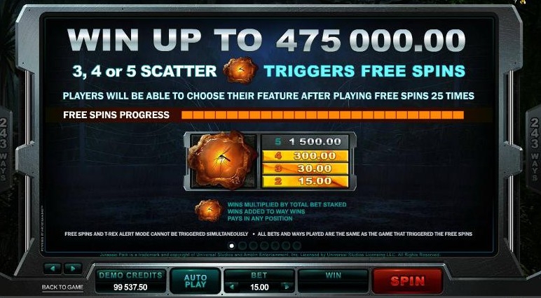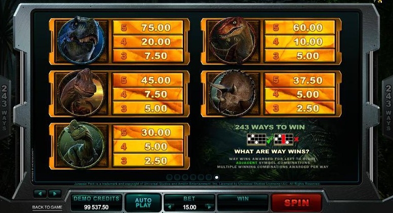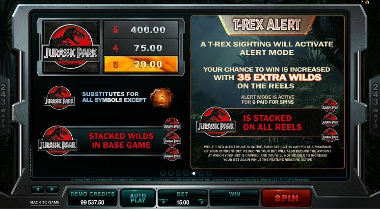 Игровой автомат с раскладкой 5x3 имеет 243 линии выплат. Звуковые эффекты и графика игрового автомата создают ощущение эскапизма и прекрасно погружают в атмосферу фильма. Про динозавров сняли много разных фильмов, но Jurassic Park выделяется на их фоне. Он заслуженно стал культовым фильмом и получил, если помните, несколько премий американской киноакадемии. Игровые слоты подхватили эстафету, правда призы им выдаёт Global Gaming Awards. Динозавры в Парке Юрского периода выглядят реалистично, а Ти-Рекс может и сейчас напугать многих, несмотря на то, что фильм снят более двух десятков лет тому назад. Над фильмом в свое время работали сильнейшие специалисты «Industrial Light & Magic», так что неудивительно, что спустя столько лет, их изображения до сих пор используются в игровом автомате. Скрупулезная работа специалистов над фильмом теперь еще дополнена скрупулезной работой разработчиков игрового автомата, которые создали продукт, в котором и графические, и звуковые элементы прекрасно сочетаются.