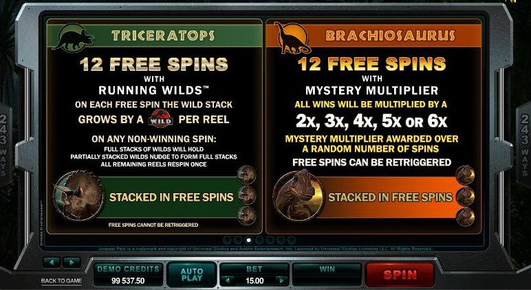 Всего есть 5 режимов бесплатной игры, которую вы можете активировать в этом игровом автомате, и каждая из них названа в честь разновидности динозавров: Тираннозавр-Рекс, Велоцираптор, Трицератопс, Брахиозавр, Дилофозавр. Все они разные: некоторые бонусные игры бесплатных вращений дополнены опциями множителя и возможностью раздваивания диких символов (в бонусной игре Велоцираптора). Другие используют бегающие дикие символы во время бесплатных вращений (в бонусной игре Трицератопса) или оснащены дополнительными дикими символами (в бонусной игре Дилофозавра). Интригу добавляет еще и мистический мультипликатор в бонусной игре Брахиозавра. Но самой необычной опцией оснащена бонусная игра Ти-Рекса, в которой дикие символы могут покрыть все барабаны. Не в каждой игре можно найти 35 дополнительных диких символов! От такого обилия опций захватывает дух, и каждую хочется попробовать, что добавляет слоту играбельность. Ну а динозавры, которые периодически мелькают на экране, пока крутятся барабаны, вносят дополнительные очки в пользу этого слота.