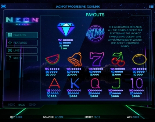 Приятная особенность, включенная в игорный автомат Neon Reels - прогрессивный джек-пот, что не может не радовать! Он выпадает при 5 одинаковых символов на линии выдач. Где можно сыграть в Neon Reels? Сыграть в Neon Reels предоставляет возможность игорное заведение SlotsMillion.