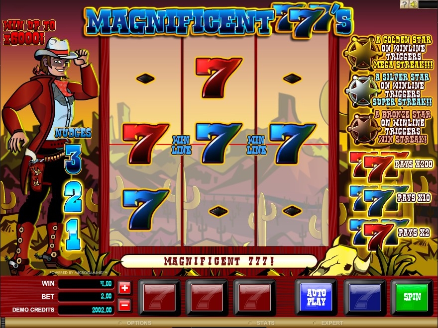 Обращаем внимание всех любителей азартных развлечений на то, что в данном увлекательном игровом автомате открыта вакансия шерифа. Должность весьма престижная и, что самое главное, отлично оплачиваемая. Любой может попробовать себя в роли шерифа одного из техасских городков, ведь игровой автомат Magnificent 777’s абсолютно бесплатный не требует предварительной регистрации для бесплатного режима игры. Как вы уже, наверное, догадались, действия будут разворачиваться на диком западе, который полон бандитов и различных опасностей. Игроку предстоит раскрывать преступления, участвовать в погоне за преступниками. Если работа шерифа будет полностью удовлетворять жителей города, тогда ему отличные премиальные обеспечены.