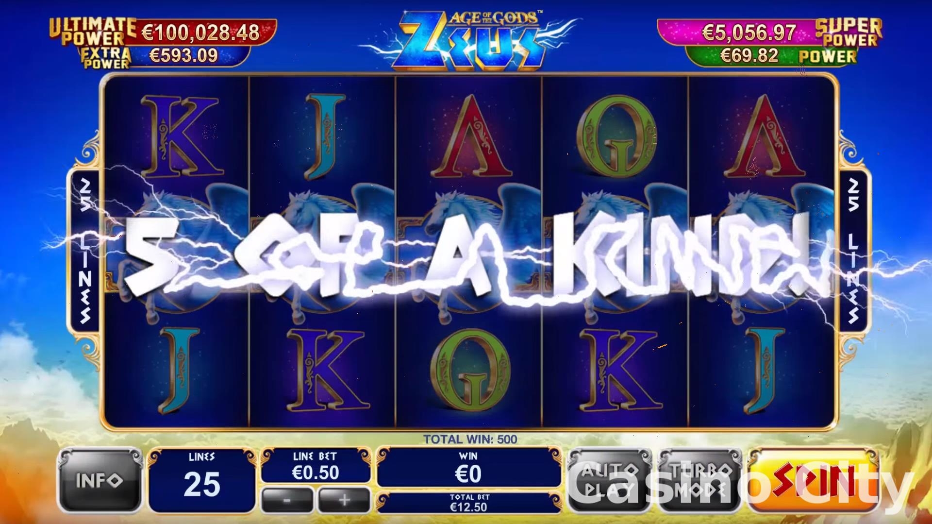 В игре четыре прогрессивных джекпота (Power, Extra Power, Super Power и Ultimate Power), которые разыгрываются в случайном порядке при попадании на специальную игру. На поле из двадцати квадратов спрятаны сокровища, сравнимые по ценности со всеми богатствами Олимпа. Вы сможете их забрать при условии, что Зевс благоволит к вам и позволит собрать три одинаковых символа определенного джекпота. В игре предусмотрен турборежим, значит, барабаны будут вращаться намного быстрее.