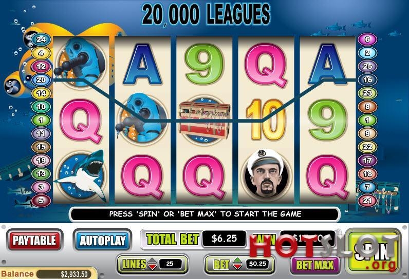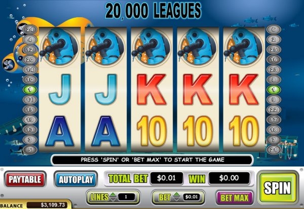 Еще один увлекательный видео-слот от компании CryptoLogic был отмечен игроками. Его название 20 000 Leagues, он содержит пять барабанов и девять линий. Сюжет автомата основан на легендарном произведении Жюля Верна. Поклонники «20 000 лье под водой» оценят тематическое оформление и точность передаваемых изображений игрового автомата. Помимо стандартных символов казино 9, 10, J, Q, K, A, видео-слот содержит дополнительные символы Капитана Немо, акулы, водолаза и сундука с сокровищами.