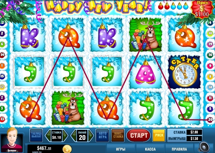 Как известно, “Новогодний” является рекордсменом по уровню выплат. Вы нигде не найдете, особенно в обычных игровых залах, игровой автомат, у которого уровень выплат около 98%. В основе игры очень простой принцип: Вы вращаете барабаны и за выпадение определенных комбинаций, получаете приличные суммы. Вы собственноручно определяете величину ставки на каждую игру. Сначала определяете размер монеты: 1,2,3,5,10,15,20,50, центов; 1,2,5 долларов. Очевидно, что диапазон очень широкий. У Вас есть возможность игры как на одну монету, так и на пять монет одновременно, сделать выбор можно с помощью клавишей Bet One. Последнее, что Вам останется, это выбрать желаемое количество игровых линий выплат, от одной до двадцати.
