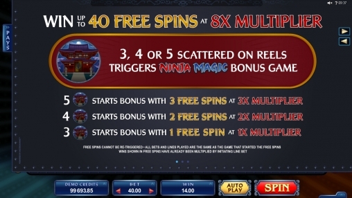Ninja Magic предлагает игрокам помимо стандартных опций геймплея, бесплатные вращения барабанов с дополнительными увеличителями выигрыша.