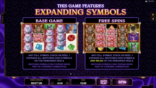 Отличие этого красочного слота от остальных ему подобных, пожалуй, состоит в том, что стекированные символы кошечек могут расположиться во всех ячейках барабанов, что приносит игрокам многочисленные дополнительные выгоды. Особые символы и бесплатные вращения барабанов лишь добавляют привлекательности для любителей слотов, к тому же не стоит забывать об основных правилах данного автомата, дающего возможность выигрывать на комбинациях, не привязанных к линиям.