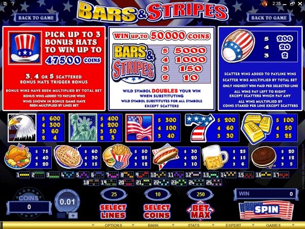 «Bars&Stripes» – это увлекательное путешествие по двадцати пяти линиям, которые познакомят вас с удивительной и самобытной культурой Америки. Если бы эта игра отражала русские традиции и то, как видят эту страну иностранцы, то мы бы наблюдали здесь символы в виде медведей, балалаек и бутылок водки. Но поскольку здесь речь идет об американской действительности, то игрокам будут встречаться атрибуты фаст фуда во всем их разнообразии. Здесь потекут слюнки при виде аппетитной пиццы, любимых хот-догов, гамбургеров и жареной картошки фри. Но Америка – это не только Макдональдс и другие рестораны быстрого питания. Здесь вы также увидите статую Свободы, американский стяг и белоголового орлана.
