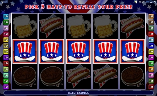 Видео слот оснащен бонусным символом (это картинка, изображающая цилиндр знаменитого дядюшки Сэма). Для запуска бонусной игры необходимо три таких специальных символа. Иконки с цилиндром могут формировать выигрышное сочетание независимо от активных линий, поскольку этот же символ наделен еще и свойствами символа разброса.