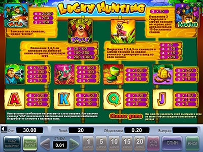 Очередная новинка от GloboTech под названием «Lucky Hunting» уже успела получить целую массу положительных отзывов от заядлых геймеров со всего мира. Это видео-слот функционирует в соответствии со стандартными механизмами – в нем присутствуют 5 барабанов с 20 линиями выплат. И тем не менее, внимание к себе он привлекает очень большое, благодаря многим бонусам, призовым играм и впечатляющим выплатам. «Lucky Hunting» - этот реальная охота за деньгами.