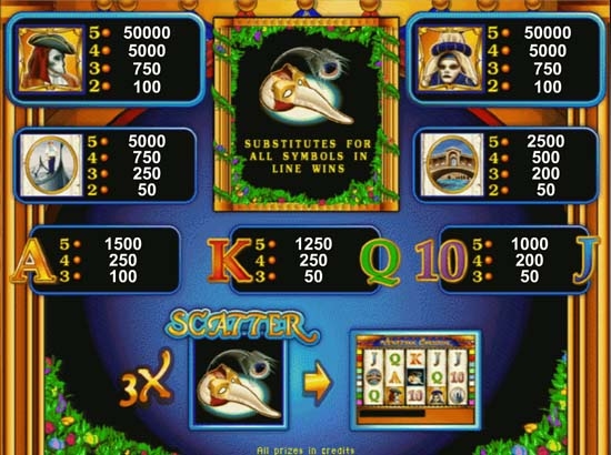 В переводе его название означает Венецианский карнавал, и совсем не зря, поскольку он затмевает всех своих предшественников и аналогов, благодаря разнообразию увлекательной символики. Среди линейки Гейминаторов, этот слот сразу стал фаворитом благодаря своим неповторимым игровым свойствам, а его оригинальная бонусная игра не похожа ни на одну ранее предложенную.
