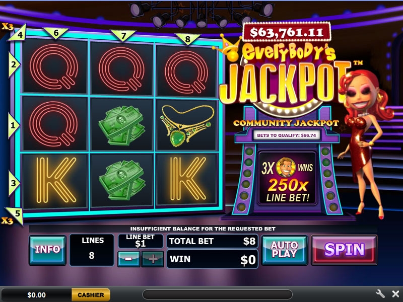 Причина активной эксплуатации «Everybody's Jackpot» объясняется еще и тем, что на данном аппарате джек-пот, по сути, достается не одному игроку, часть его распределяется и между несколькими другими счастливчиками, которые сделали квалификационные ставки в течение двадцати четырех часов до момента выигрыша главного приза. Такие игроки разделят между собой тридцать процентов пула.