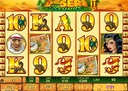 В его состав входит двадцать игровых линий и пять барабанов. Благодаря этому игровому автомату вы полностью можете довериться собственному чутью и сделать ставку, размер которой определите самостоятельно. Минимальная ставка – 5 центов, максимальная – 5 долларов. Создатели Desert Treasure изо всех сил старались сделать максимально комфортные и интересные условия для игрока при помощи удивительной атмосферы песков и барханов. Трудно не согласиться с тем, что им удалось выполнить свою задачу на все 100%.