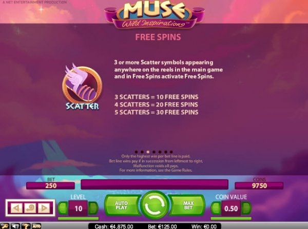 При выпадении символа Wild ("муза") она заменит в выигрышной линии картинки на недостающие, если это необходимо. Замене подлежат все картинки, кроме другого бонусного изображения - Scatter ("сандалии с крылышками").