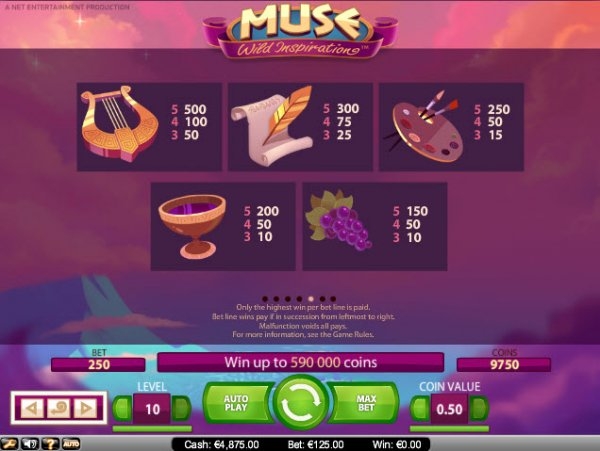 Название этого игрового автомата можно перевести как "Муза: Вдохновение дикости". Программистов из компании "Net Entertainment" вдохновили на создание такого игрового интерфейса мифы древней Греции, в которых музы - это девять дочерей верховного бога Зевса и Мнемосины, отвечавшие в пантеоне за различные виды искусств и наук.