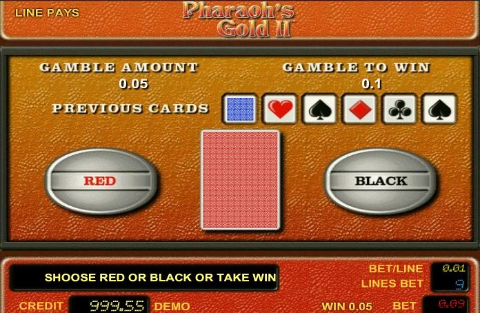 Если вы относитесь к числу максималистов, то для вас есть отдельная клавиша ВЕТ, которая автоматически выставляет максимальные ставки и игра идет на грани. Перед началом игры можно выбрать игровые линии, по которым будут считаться выигрышные комбинации. Это свойство присуще всех автоматам, серии Гейминатор от Новоматик. В слоте Pharaoh Gold 2 имеется игра на удвоение выигрыша, которая позволяет увеличить сумму в кошельке в несколько десятков раз, но для этого необходимо отдельное везение. Суть бонусной игры заключается в угадывании масти карты, если выбор был сделан верное, то вы победили, если нет, то все полученные кредиты аннулируются.