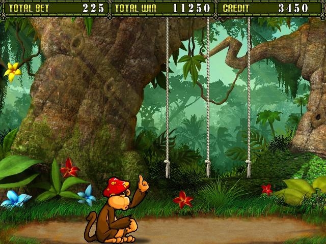 Комбинации на слоте игроку предстоит собирать из животных, грибов, бабочек – короче говоря, ничего оригинального и интересного. А вот бонусная игра открывает более привлекательные перспективы перед пользователем. Здесь немножко придется подергать канатики. Если вы выберите правильный, то получите на свой счет призовые кредиты, ну а обезьянка сможет полакомиться связкой бананов. В случае неверного выбора, дополнительная игра тут же завершится, мартышка от такого исхода тоже не будет в восторге – на ее голову обрушиться несъедобный и, наверное, тяжеленький предмет.