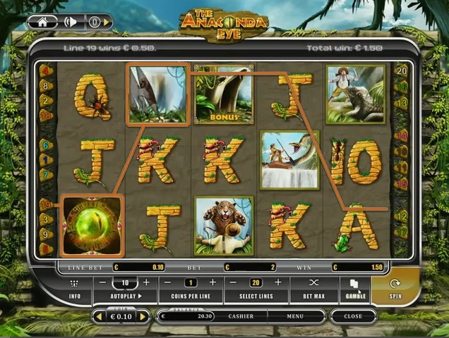 Главный герой этого слота – охотник за сокровищами. У него есть пистолет, наостренный мачете и еще некоторые артефакты. На пути героя встречаются разные противники, то леопарды, то крокодилы. Охотник ищет глаз анаконды и не собирается останавливаться ни перед че, так пускай же и тот, кто сел играть за слот Anaconda Eye, не прекращает свою погоню за денежным призом. Чтобы узнать, сколько стоит каждый символ в этой игре, нужно нажать клавишу «Инфо». Вся подробная информация сразу же откроется любопытному игроку.