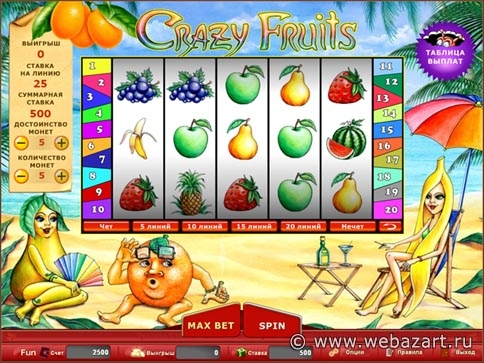 Слот Fruits состоит из троих барабанов, на которых могут выпасть 11 призовых комбинаций. Темой слота, как видно по названию, являются фрукты. Их не так много, поэтому и выигрышных комбинаций небольшое количество. Если составить рейтинг самого крупного выигрыша, то самую нижнюю строку займут Вишни. После них по возрастанию идут Сливы, Арбузы, Апельсины, Ананасы и Бананы. Второй по размеру джекпот вы получите благодаря комбинации из Персиков. Его размер равен 25 тысячам монет. Основной джекпот вам принесет Клубника - 50 тысяч монет. Поскольку ставки пересчитываются в монеты, вы не должны играть исключительно максимальными ставками, чтобы победить. Все очень просто: выпала комбинация - получите-распишитесь, приз ваш. А призовые комбинации на Cool Fruits выпадают стабильно.
