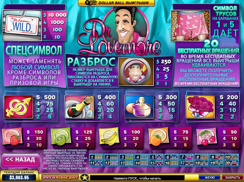 Если на экране в одно время на первом и пятом барабанах появились розовые штаны Dr. Lovemore, то вы получаете 12 бесплатных вращений.