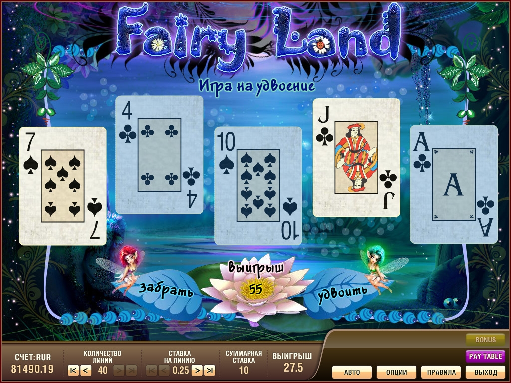 Однозначно этот интересный и непростой игровой автомат под названием Fairy Land (Волшебный остров, Лягушки, Фэйри Лэнд) не может оставить равнодушным истинных поклонников видеослотов. Основной причиной такой популярности является тот факт, что Фэйри Лэнд предоставляет неземные шансы на победу: заработок всегда быстрый и легкий. Достигнуть такого соотношения побед и поражений помогают выплаты по выигрышным комбинациям, бонусная игра и игра на риск. Поэтому, кроме увлекательного игрового процесса, вас ждут и сумасшедшие шансы получить неплохой денежный приз.