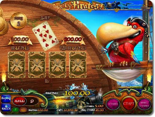 В слоте так же есть риск-игра. Тут вы либо пан, либо пропал. На кон придется поставить все раздобытое золото. В случае удачи ваш выигрыш удвоится и возможно ни один раз. Чтобы раздобыть джекпот, предстоит посостязаться с пиратским попугаем. У попугая в клюве карта. Ваша задача выбрать одну карту из четырех предложенных. Если ваша карта окажется больше масти, чем карта попугая – приз ваш.