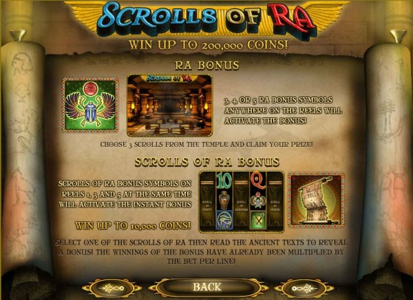 Если вы любитель Древнего Египта, то слот "Scrolls Of Ra" идеально для вас подходит. Среди символов вы наткнетесь на различные иероглифы, золотые статуэтки и даже древнеегипетские сооружения. Поэтому играя на данном слоте, у вас будет полное ощущение таинственной атмосферы, которая была свойственна тому времени. Вы не останетесь равнодушным ни к самому автомату, ни к процессу игры. Опытные игроки могут узнать в этом слоте давно завоевавший всемирную популярность игровой автомат от Gaminator - Book of Ra.