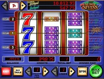 В Super Sevens всего три барабана и три линии выплат. Основная особенность и уникальность как раз заключается в том, что это видеослот достаточно прост. Среди символов вы может встретить только Семерку или Bar. Существует три вида символа Bar: он может быть одинарным, двойным или тройным. Эти символы дополняют друг друга. Поэтому, призовой считается любая комбинация из 3-х таких символов, выпавших на одной линии. Если игроку посчастливилось собрать комбинацию символов из одинаковых Barов, то его выигрыш значительно увеличится. Максимальный выигрыш равен 200-кратному размеру вашей ставки. Его вы можете получить, если символы Bar заполняют все поле игры, то есть на трех линиях выпадает по три рисунка.