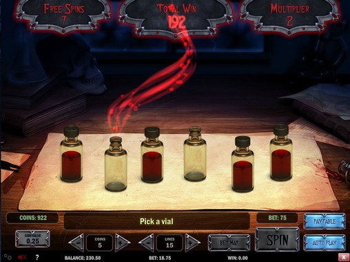 События бонусного раунда игры будут разворачиваться на дополнительном экране. В качестве приза здесь можно заработать деньги, множитель, бесплатные вращения. В чем же заключается задача игрока? Ему нужно выбирать по очереди бутылочки с кровью, стоящие перед ним на столе. Почти в каждой из них есть какое-то вознаграждение из тех, что упоминались выше. Как только участнику попадется негодная бутылочка, стадия окончится.