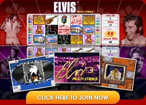 Тема второго слота построена полностью на Элвисе, короле рок-н-ролла. Это игровой автомат Elvis Multi Strike от WagerWorks. Хотя он не так визуально богат, как Rock On! она представляет некоторые интересные особенности. Фанатам Элвиса этом автомат придется по нраву. На вращающихся барабанах представлен набор некоторых из самых популярных фотографий Элвиса. На символах также есть интересная Элвис-атрибутика, особенно на бонусных символах. Elvis Multi Strike имеет 60 линий выплат, но они разделены тремя барабанами по 20 на каждого. Первым запускается первый набор выплат. Если на них есть выигрышей, то второй набор барабанов автоматически вращается и выплаты удваиваются. Если есть выплаты и на втором, то последний набор вращений предлагает увеличить выплаты в четыре раза. Загвоздка в том, что игрок должен поставить авансом для всех 60 линий выплат. Если комбинация из трех фотографий или «wild»-символов с изображением Элвиса появляется на барабанах, то игрок получает бесплатные вращения на следующий набор.