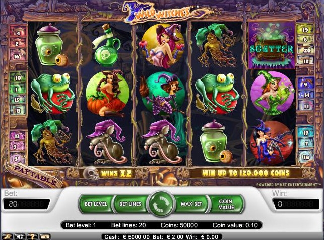 Дикие Ведьмы – это пяти барабанный не прогрессивный слот от компании Net-entertainment с 20-ю линиями выплат, кроме того у автомата имеется: дикий символ, рассыпной символ, множитель, бесплатные вращения и джек-пот размером в $40,000 долларов.