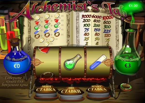 Линия, состоящая из трех золотых монет, является самой высокооплачиваемой: три, шесть и десять тысяч за одну, две и три соответственно поставленные монеты. Если игроку удастся собрать на барабанах три книжных символа, автоматически запускается бонусный уровень. Бонусный раунд начинается с того, что перед игроком появляется полка с флягами, среди которых необходимо выбрать три любые. Выбранные фляги выливаются в магический котел, и алхимик производит некое количество золота, от него и будет зависеть выплата.