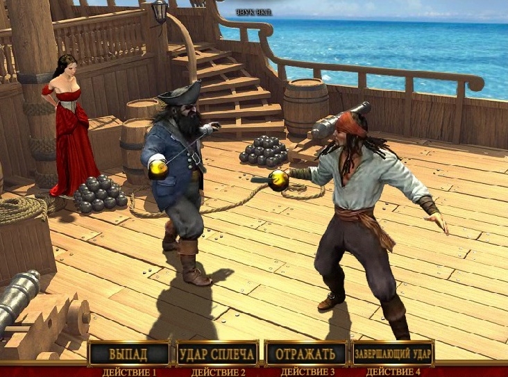 Еще одну призовую игру, которая называется «Fight» игрок может активировать с помощью наличия на своих барабанах трех и более символов с изображением капитана Черная Борода. В ходе этой вы вам лично придется сражаться с известным пиратом капитаном Черная Борода, чтобы спасти девушку, а также заслужить приличное вознаграждение.